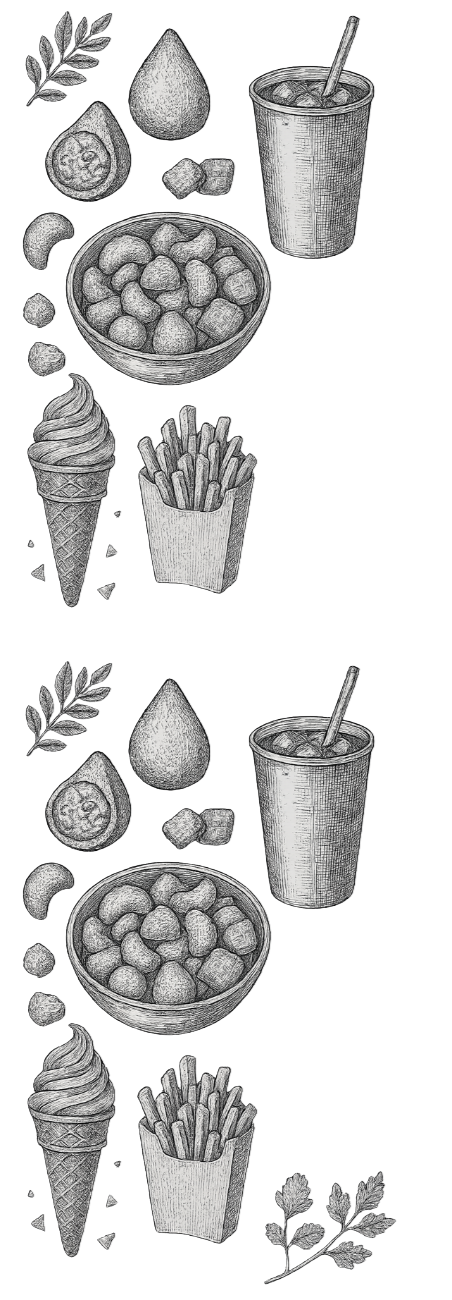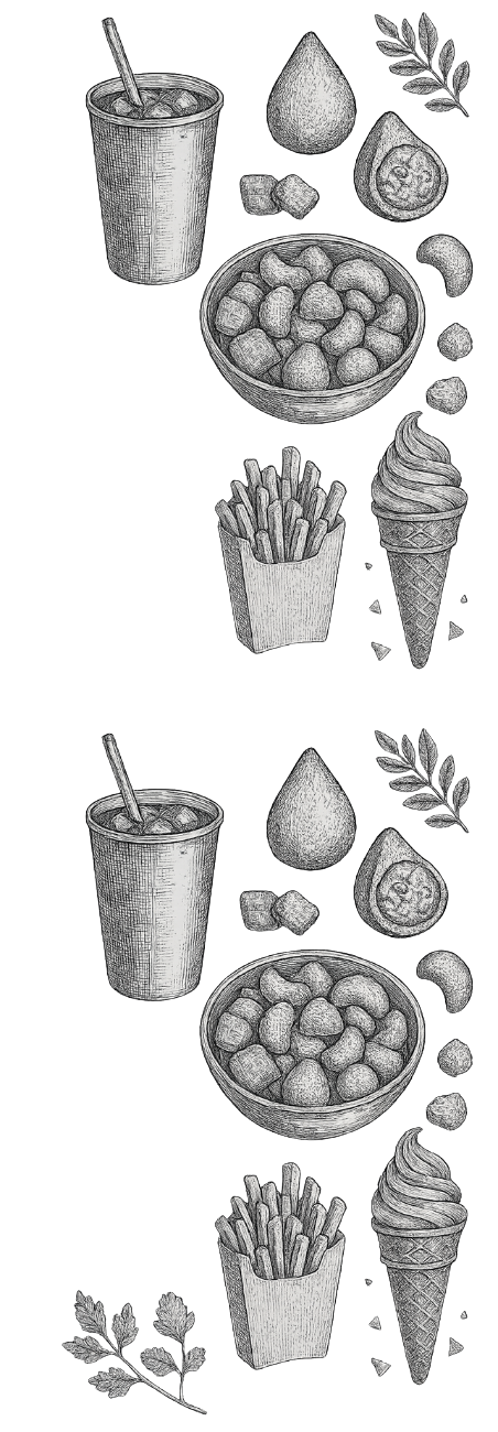 Coxinhas, bolinhas, quibes, churros e sorvetes.